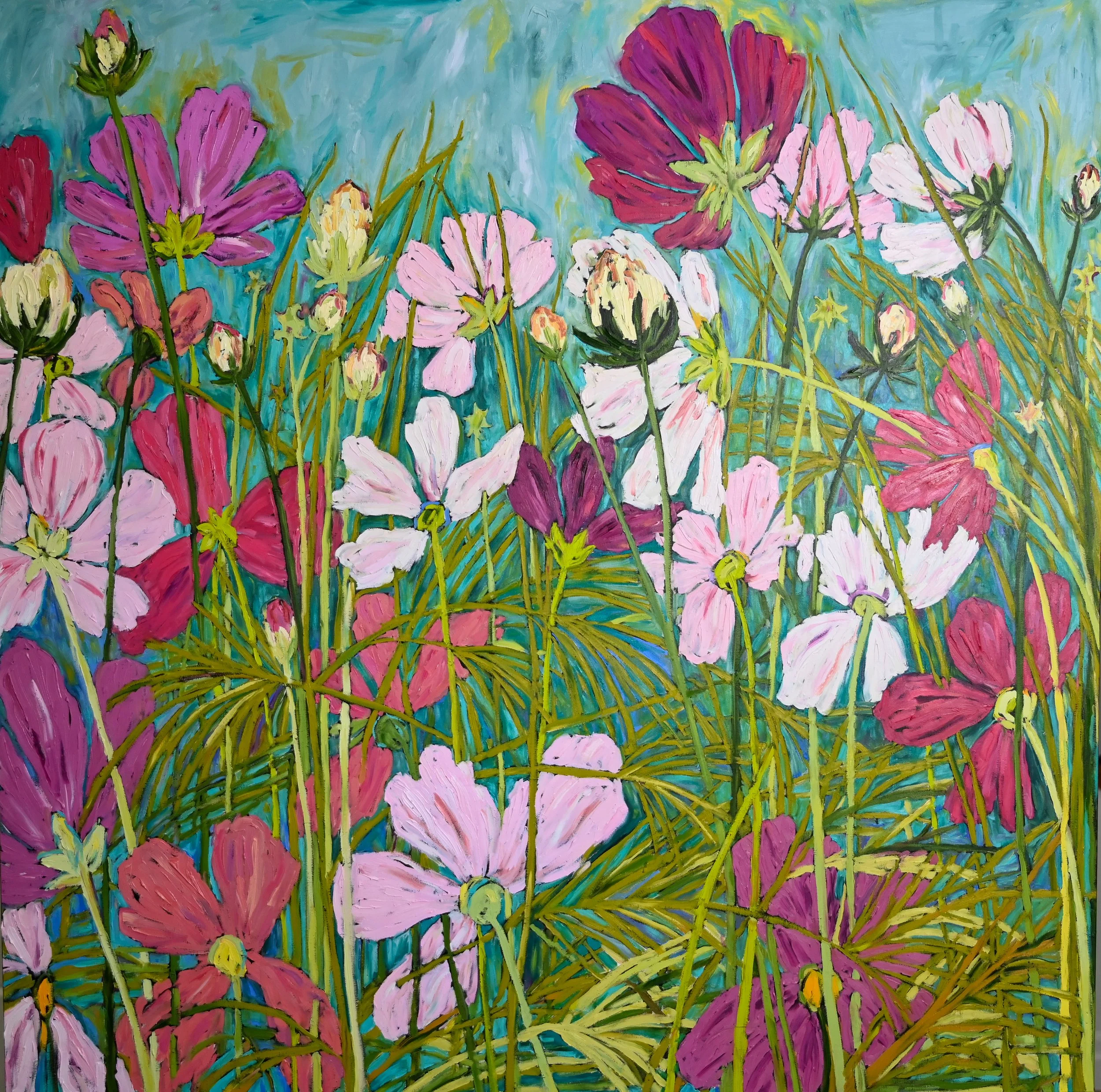 “Cosmos in the Breeze” in Aqua Oil on Canvas “48 x 48”
