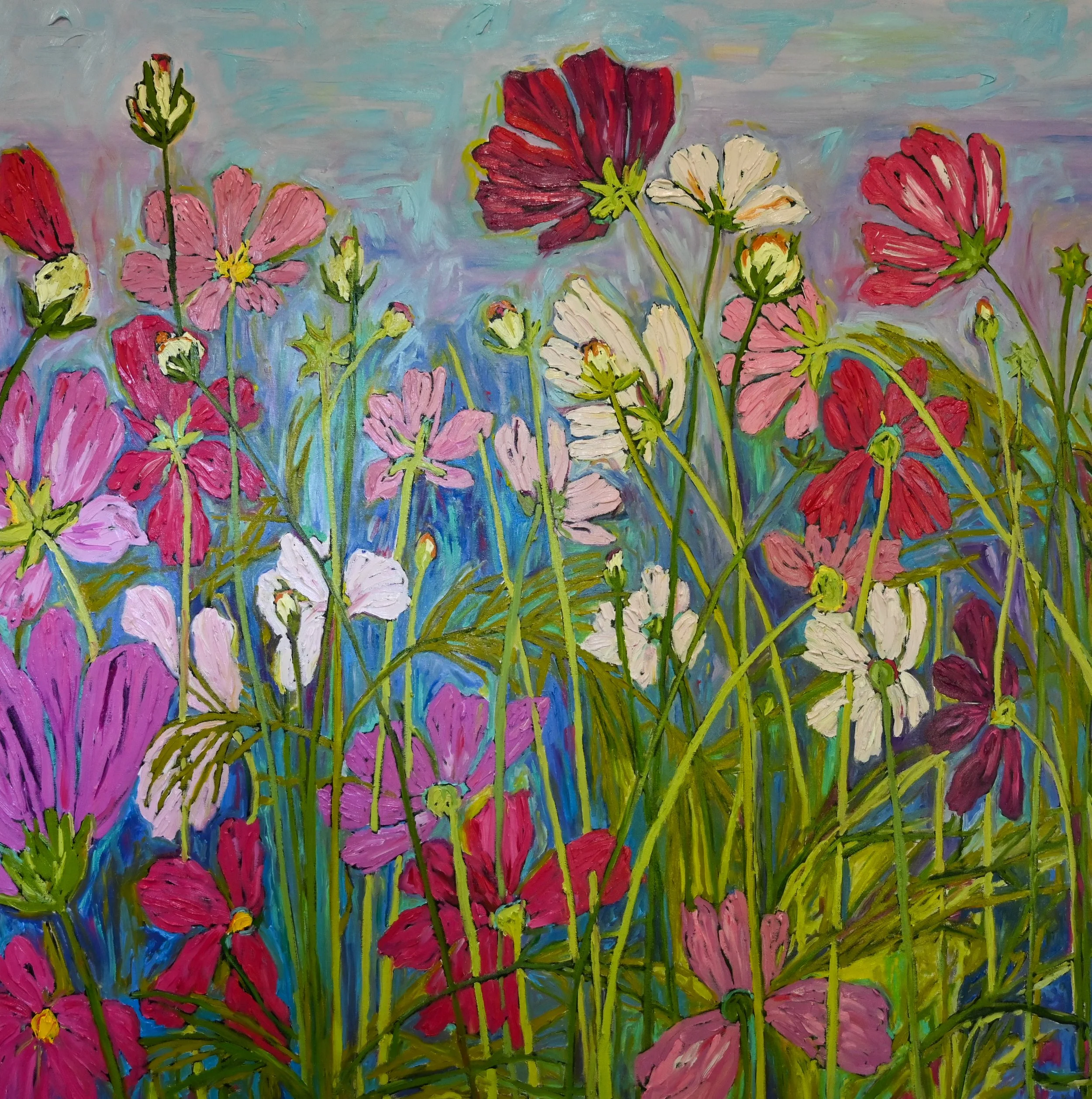 “Cosmos in the Breeze” in Periwinkle and Pink Oil on Canvas 40” x 40”