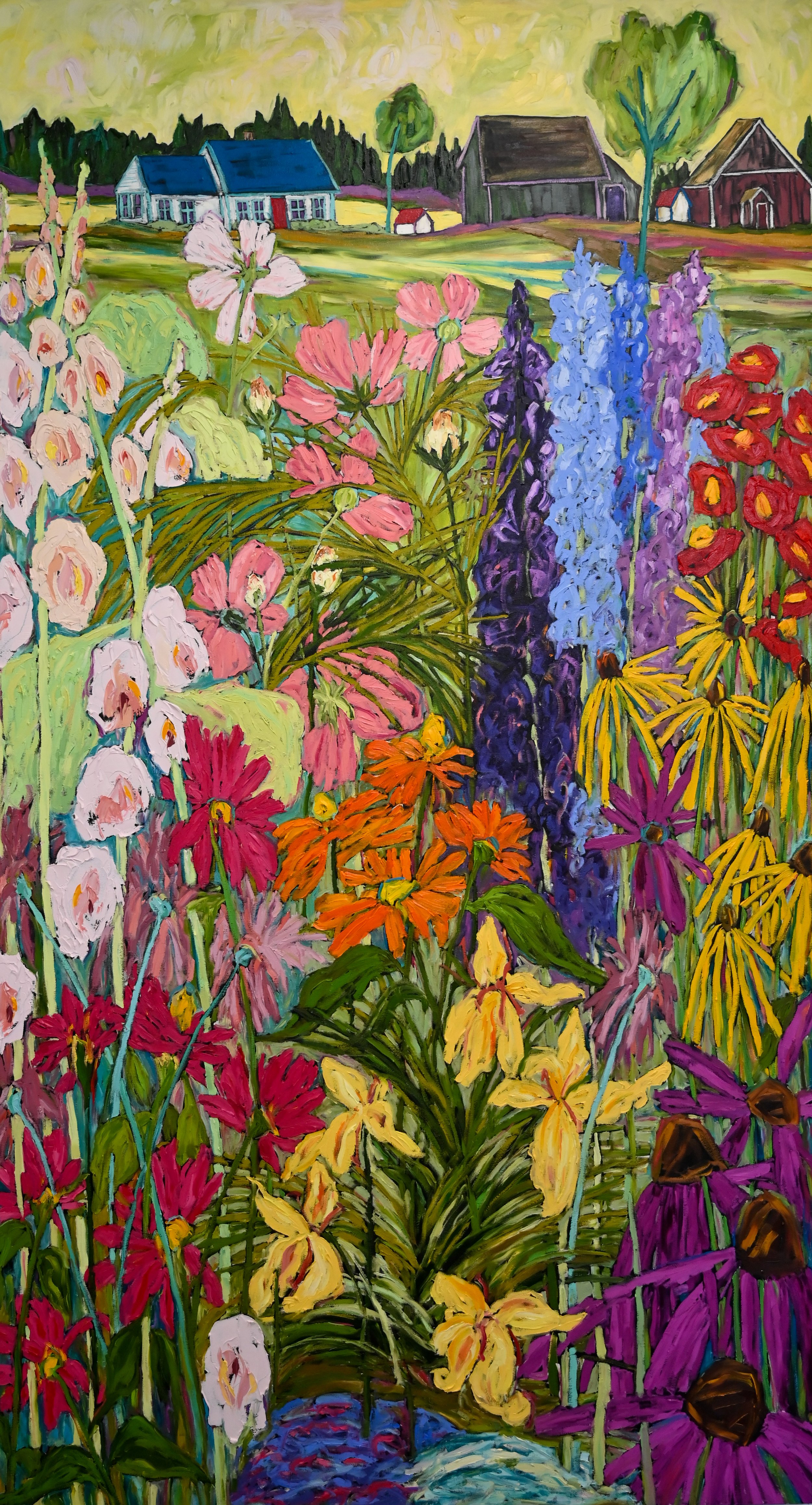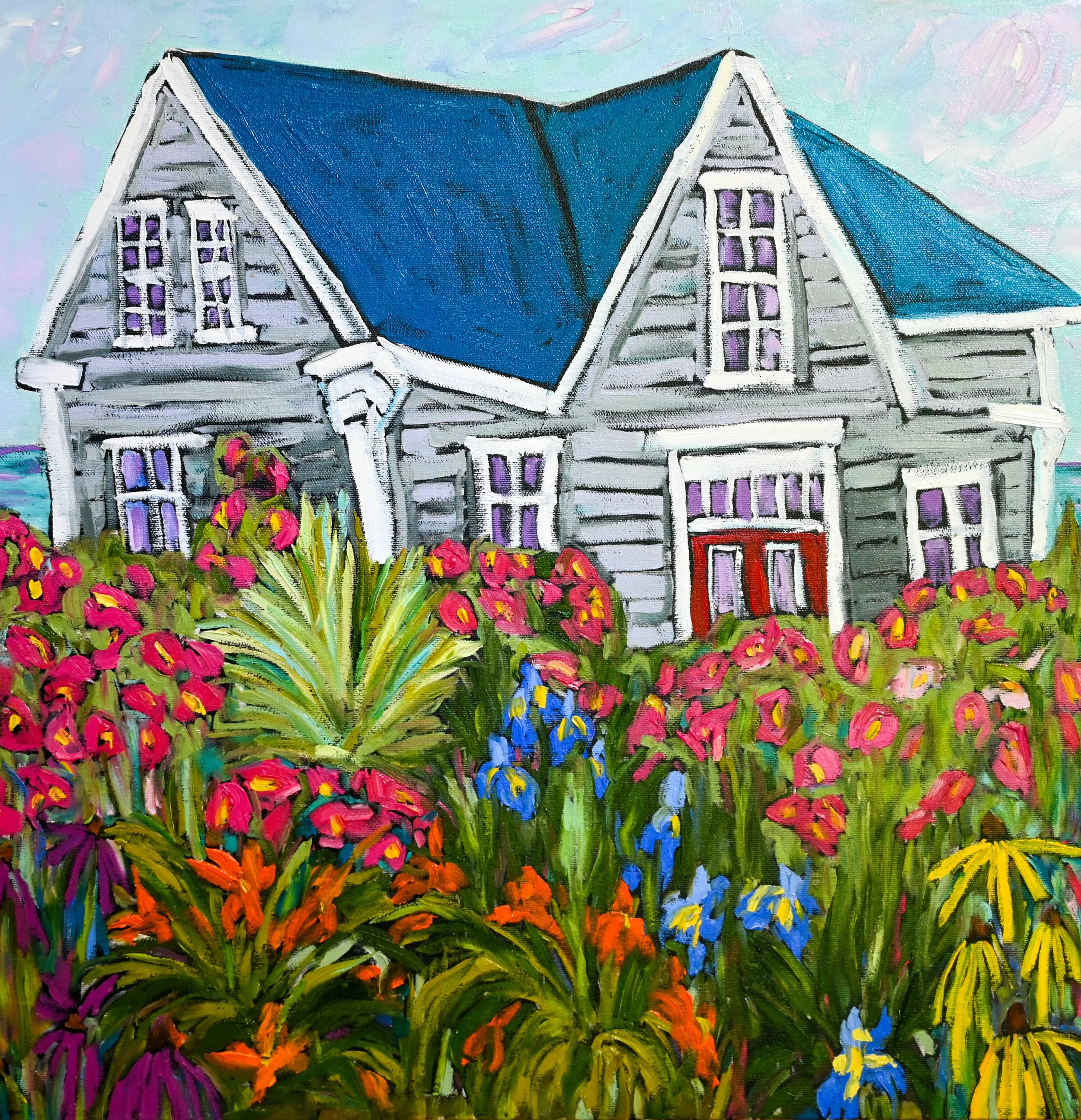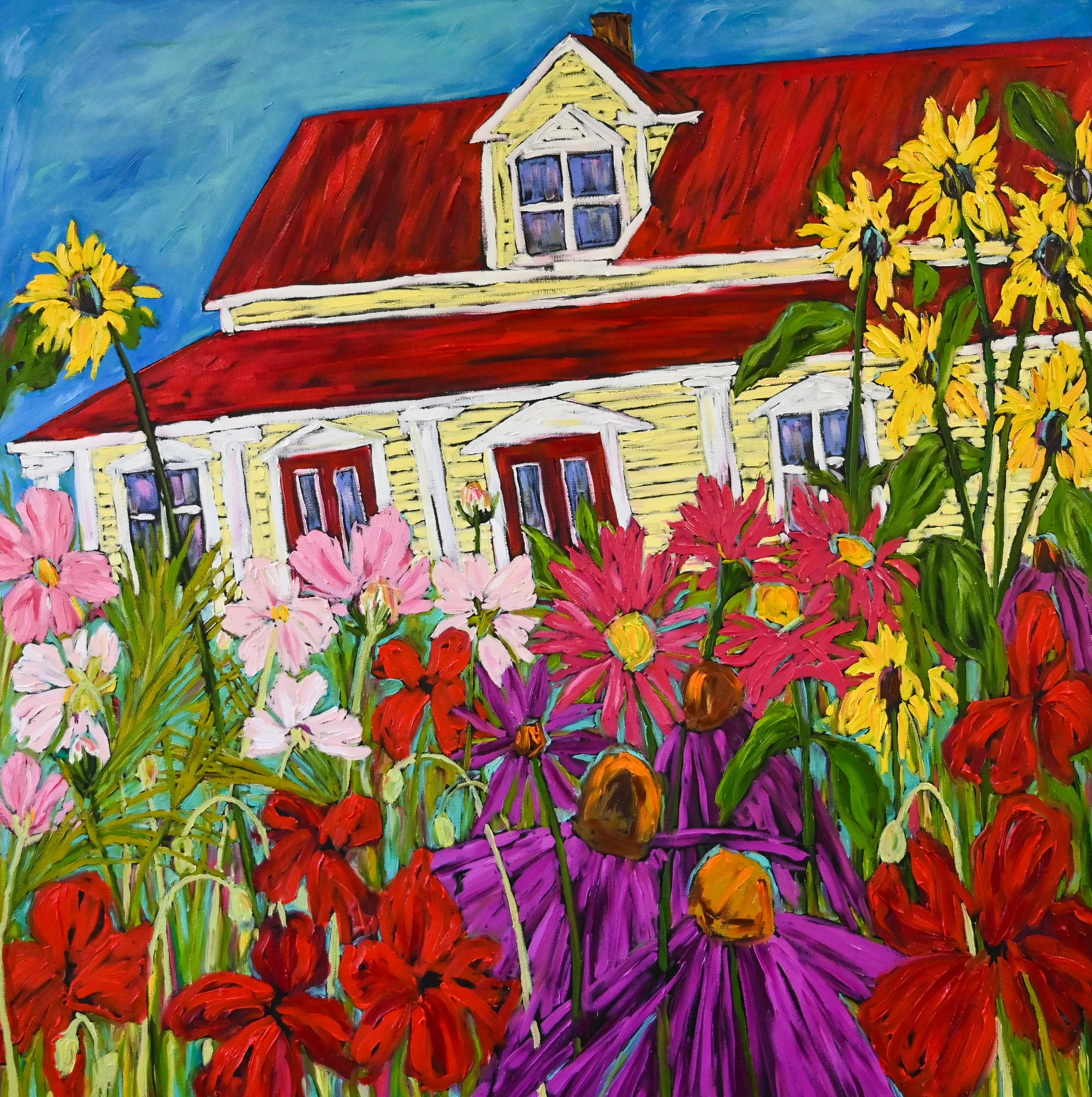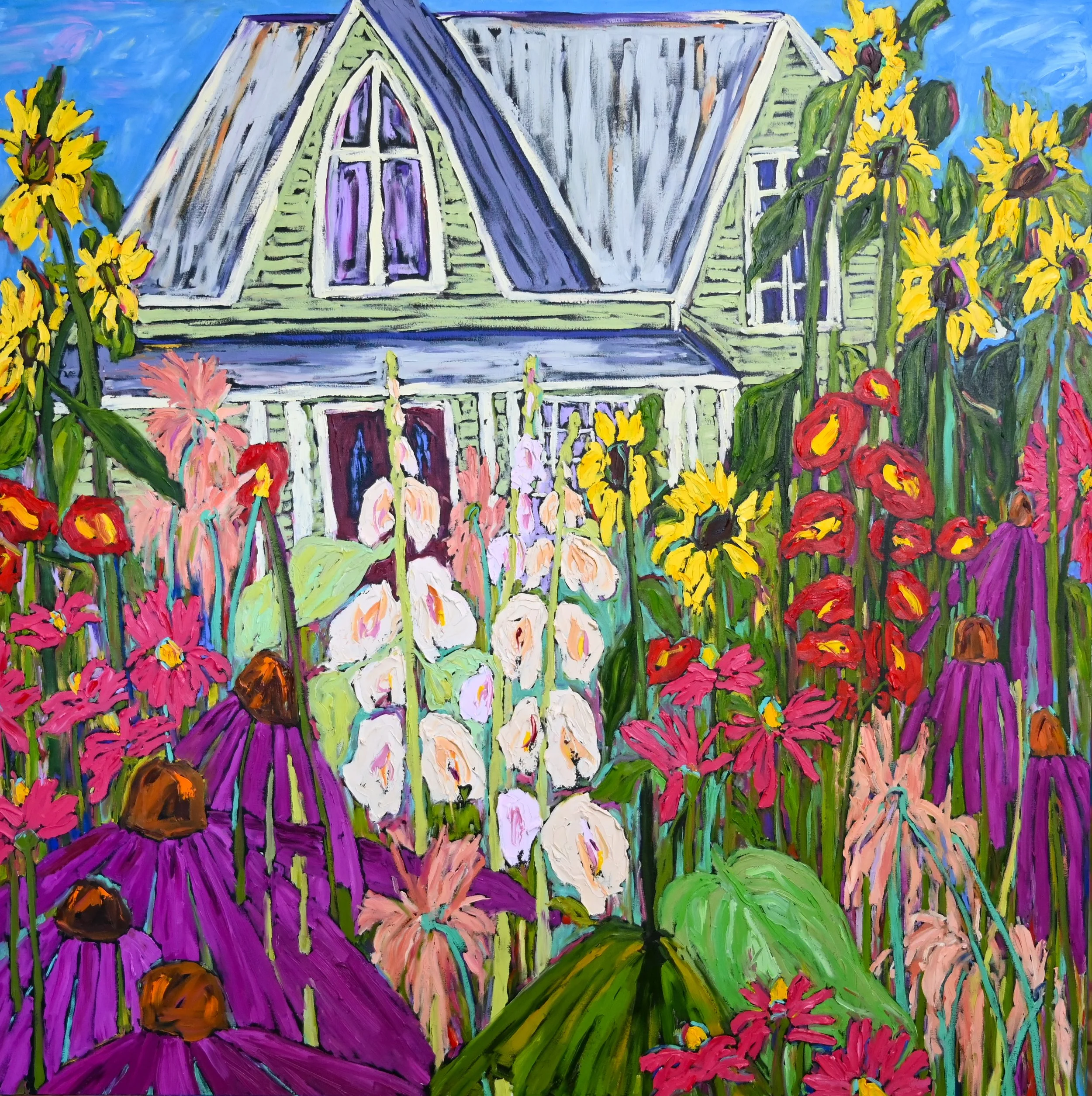 “Farmhouse with Happy Garden” Oil on Canvas 40” x 40”