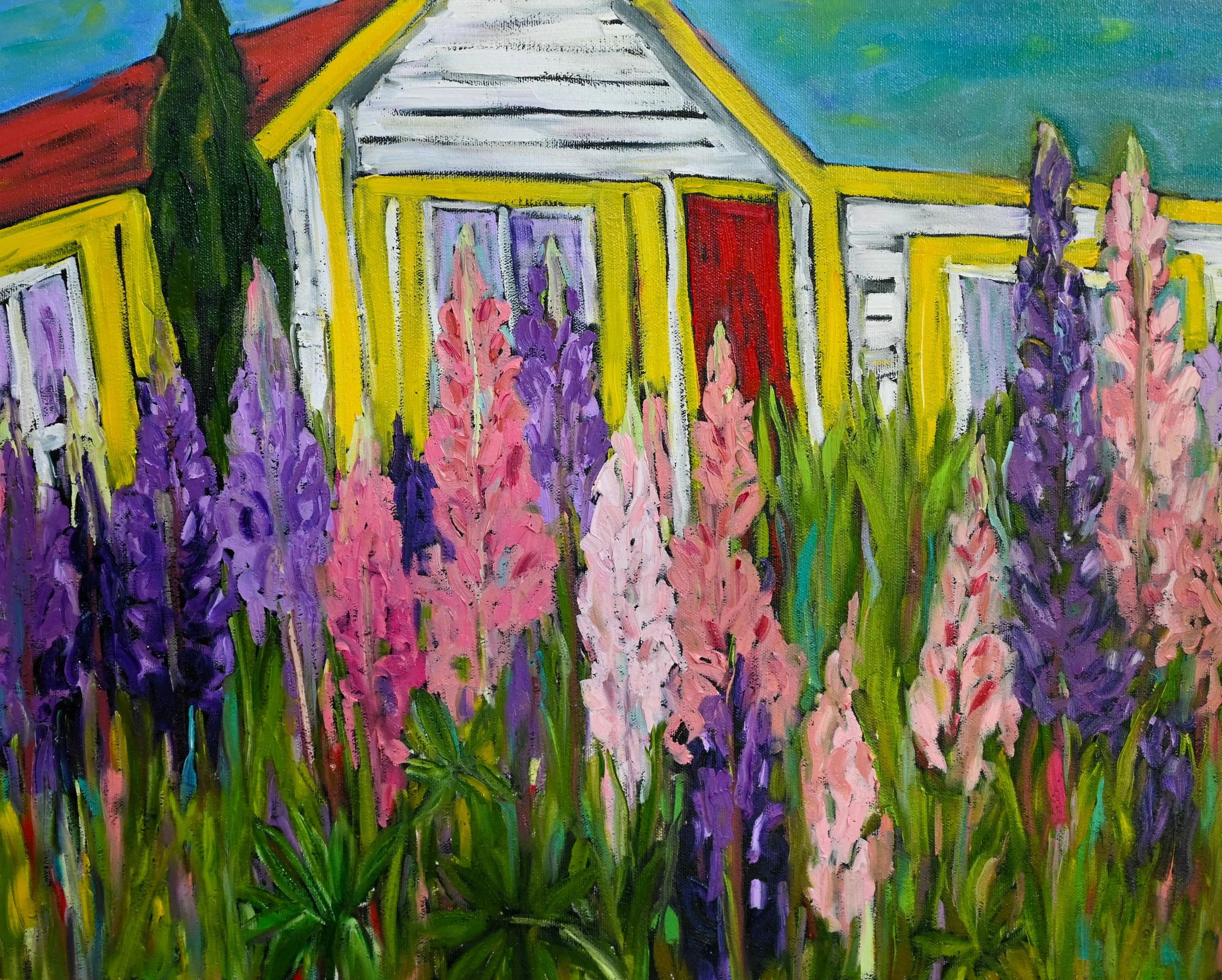 “Cottage with Lupins” Oil on Canvas 16” h x 20” w